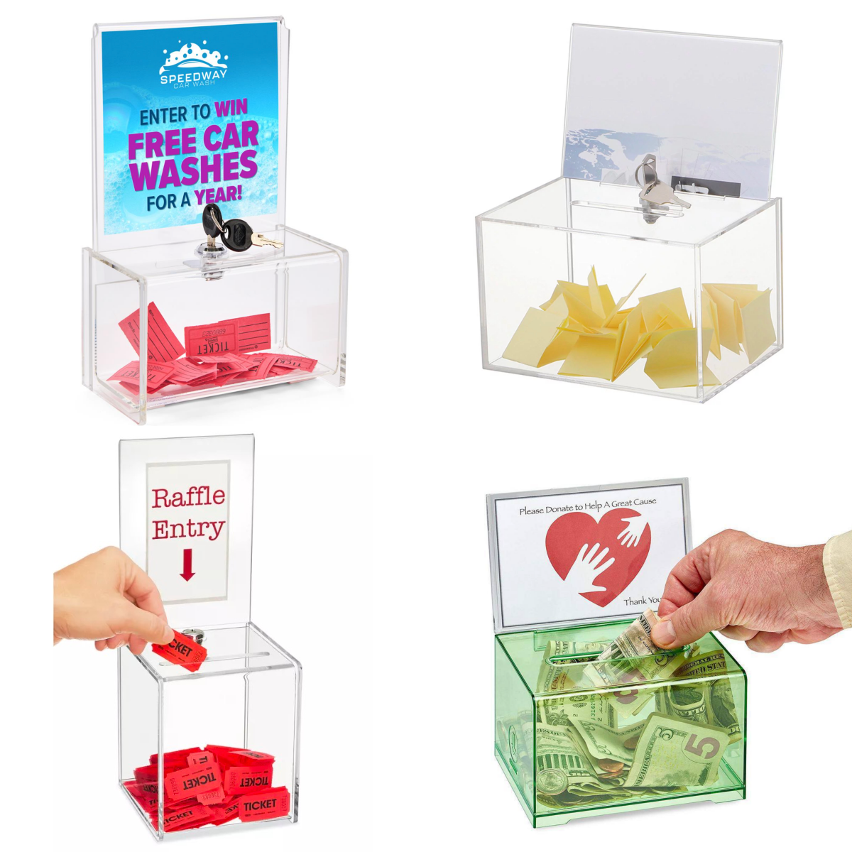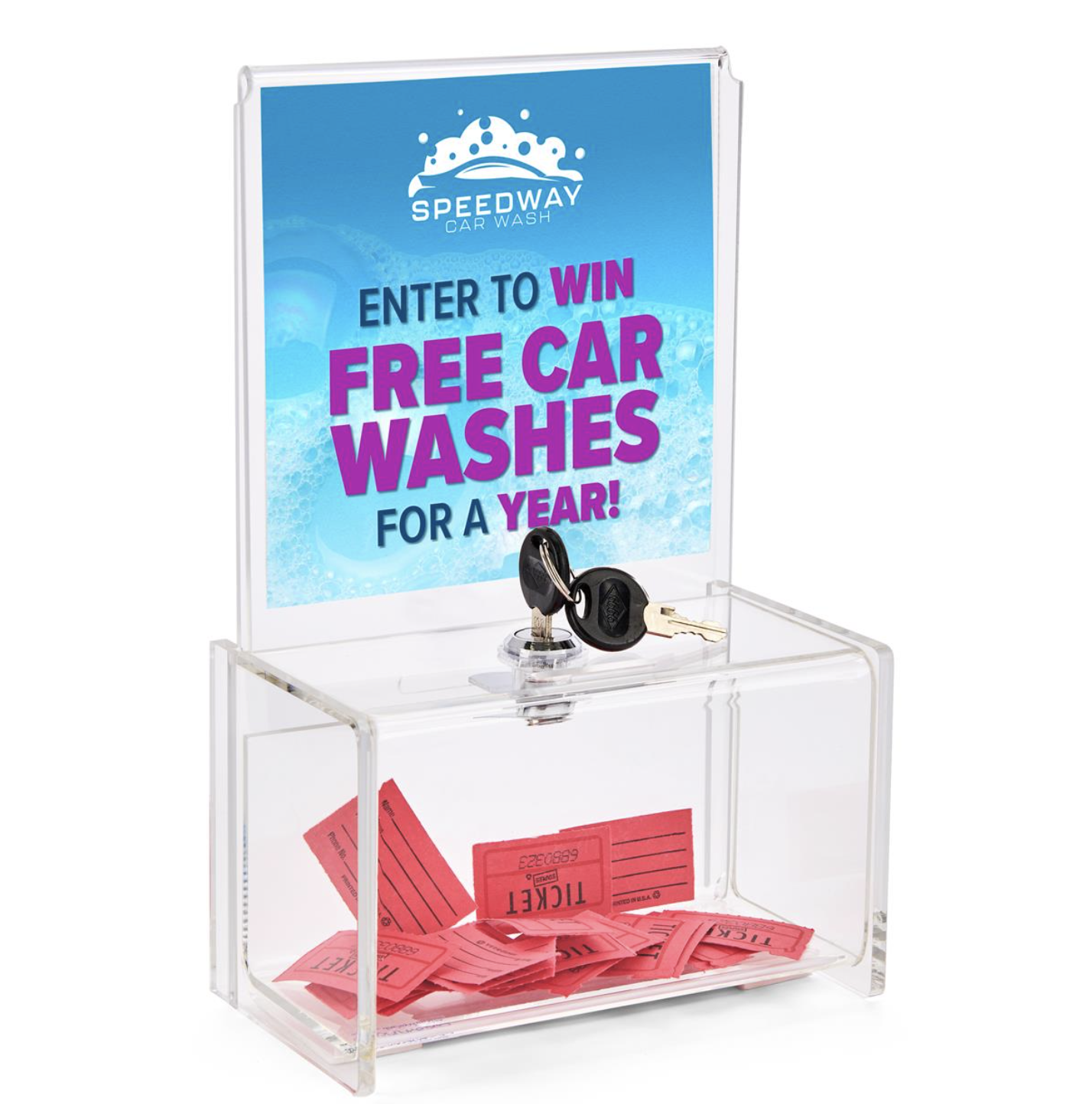 The very front of the acrylic ballot box has a convenient space for you to insert signs and advertisements. This is a great way to display any necessary information for your brand or event. Display your company logo or use a picture to coordinate with your decor. Installing and removal is easy with enough space to prevent any snagging or tearing.
