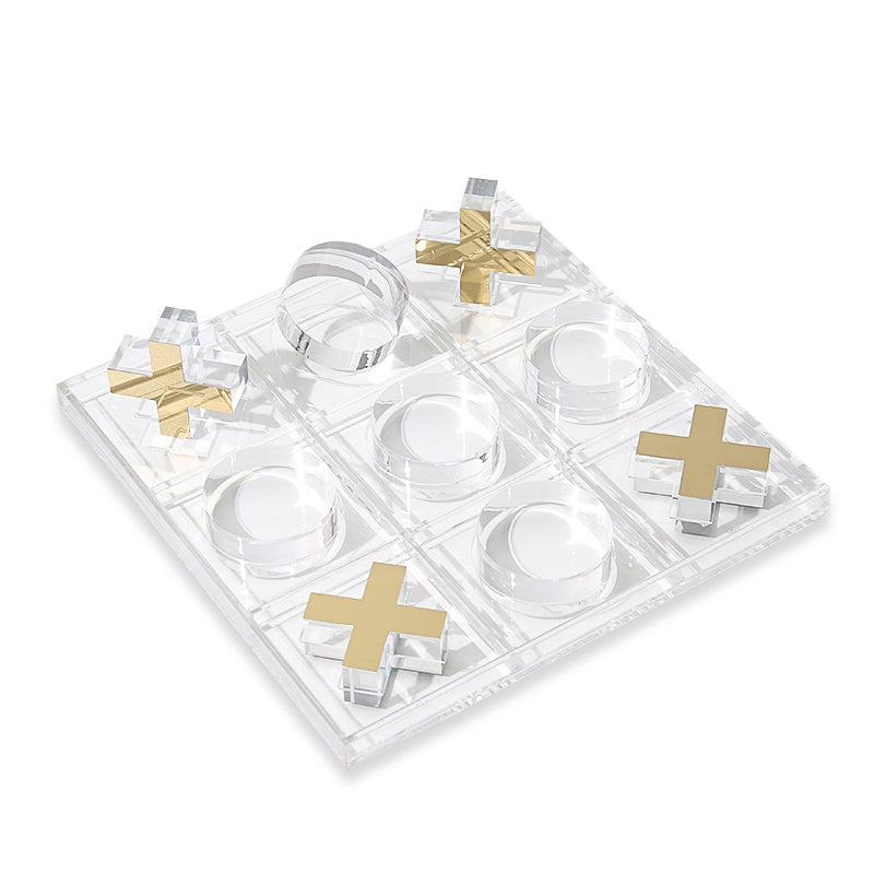 Our thick silver and gold tic tac toe board with really thick clear acrylic X and O’s creates a fun game or a cool decorative piece.