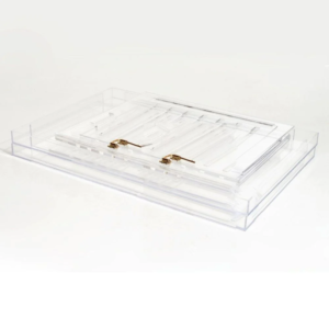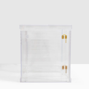 Meet the revolutionary Clear Acrylic Dog Crate to Gate, a 3 1 clear lucite pet crate that is also a modern lucite side table and a clear acrylic, freestanding pet gate! This clear dog crate gives your dog a clear view without unfriendly metal or plastic bars and is calming for the dog, not to mention for you. Smoothly polished, horizontal air openings on all 4 sides allow perfect air circulation. The 2 metal latches provide security and style. Modern, Lucite Side Table: Designed with a solid, clear lucite top, you can use it as a side table, next to your couch, chair, or bed. Freestanding Pet Gate: The removable, clear walls are made up of hinged wall panels. When removed, the walls can be used as a freestanding pet zig-zag gate that can cover openings up to 8 feet.
