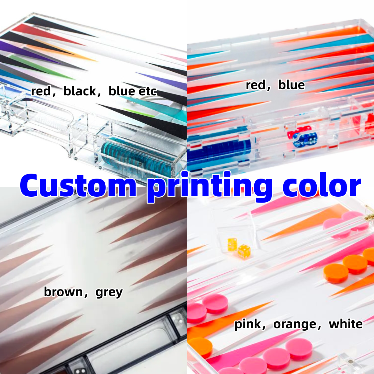 This lucite acrylic backgammon set brings a modern twist to a classic game of backgammon. It’s magnetic closure and discreet hinges provide for a sleek and minimal design, perfect for any living room, game room, office or man cave – a sure conversation starter! Set includes black and white playing pieces, two sets of dice, two dice cups and a doubling dice. size:L:14″xW:8.50″xH:2″/custom.